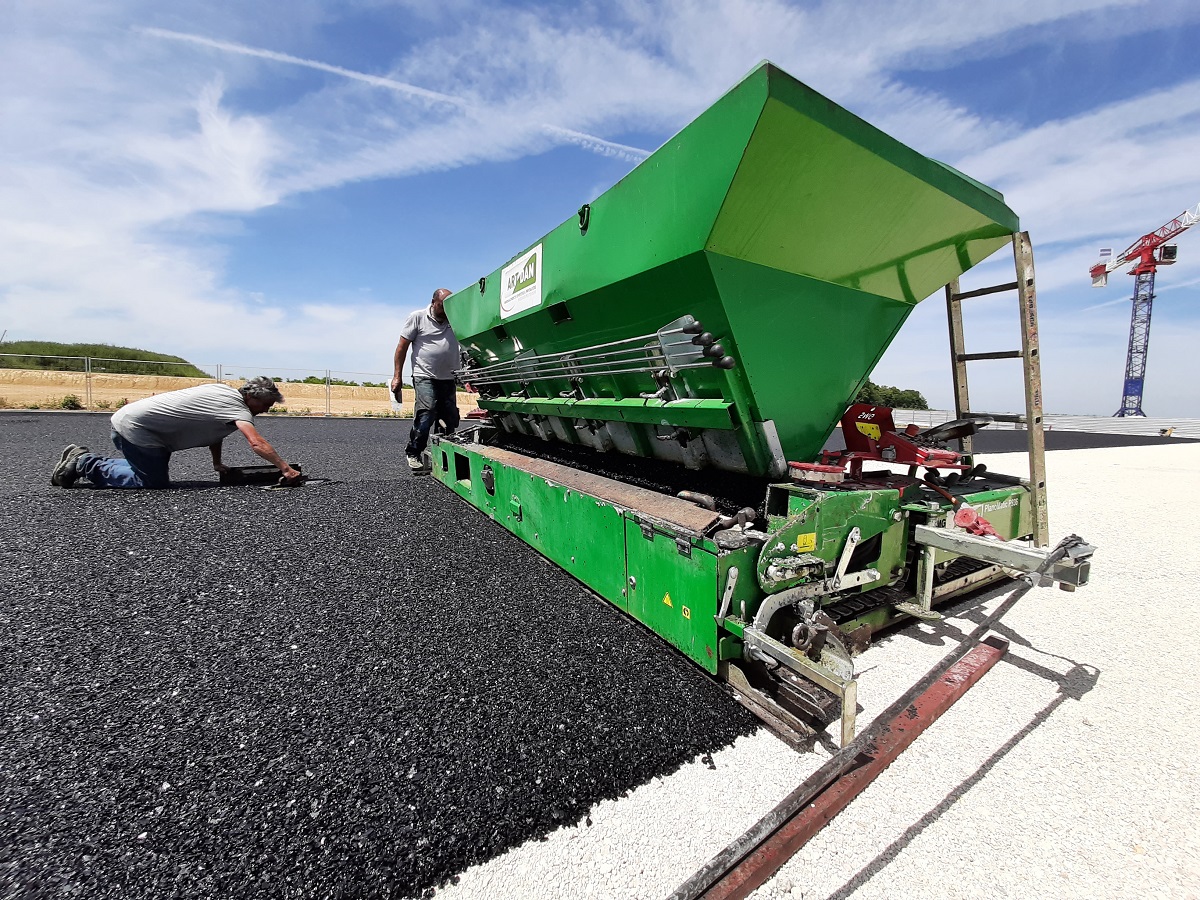 Après les traditionnelles opérations de terrassement, les équipes d’ART-DAN Ile-de-France ont réalisé une tâche particulièrement importante avec la mise en œuvre de la couche de souplesse Stobitan EL de STOCKMEIER. Cette dernière n’est pas préfabriquée, comme dans la majorité des cas, mais coulée directement sur place. Une opération minutieuse, pour obtenir une planéité parfaite et garantir ainsi les qualités sportives.