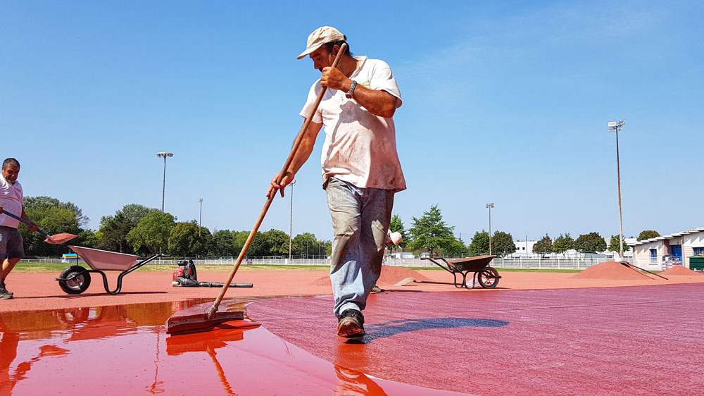Le revêtement bi-couche Resithan Pat, du fabricant Resipoly Chrysor, est coulé in-situ. Il est constitué d’une épaisse couche (ou grille) de granulats noirs en caoutchouc liés à la résine polyuréthane, elle-même surmontée d’un mélange granulat / polyuréthane donnant la couleur rouge à la piste.