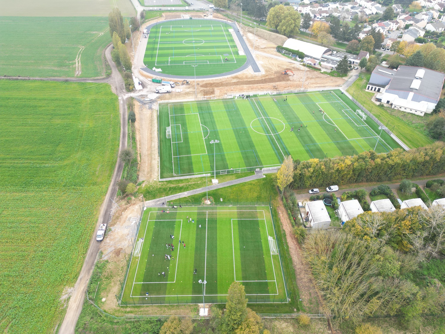 Les engins d’ART-DAN Ile-de-France se sont longuement succédé, pour réaliser les copieuses opérations de terrassement nécessaires à la métamorphose du site. Au menu des implantations, un terrain de football de 105x68m et un autre de 105x60m, intégré à l’intérieur d’une piste d’athlétisme. Un anneau de 4 couloirs en revêtement préfabriqué MONDO, complété avec 2 couloirs de saut en longueur et des aires de saut en hauteur et de lancer de poids. Sans oublier la création du Foot 5, qui a vu le jour sur une parcelle en friche.